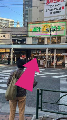 肉汁餃子のお店のところを渡り、反対側に行きます(もう少し先で渡っても問題ありません)