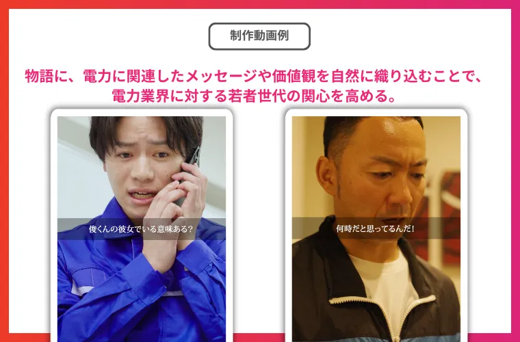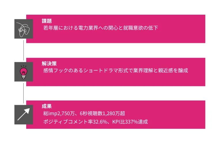 長年にわたり日本の電力業界を支えてきた電気事業連合会様。今回のプロジェクトでは、若年層をメインターゲットに、電力業界への認知と関心を高めることを目的とし、TikTok・Instagram・YouTube Shortsを活用したショートドラマ施策を実施しました。
