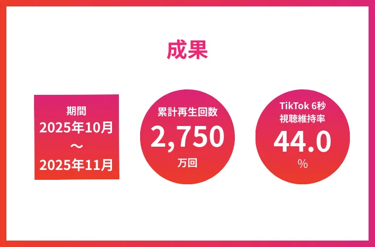本施策では、全SNS合計で2,750万回のインプレッションを記録し、6秒再生数は約1,280万回(KPI比337%)と、想定以上の成果を上げました。