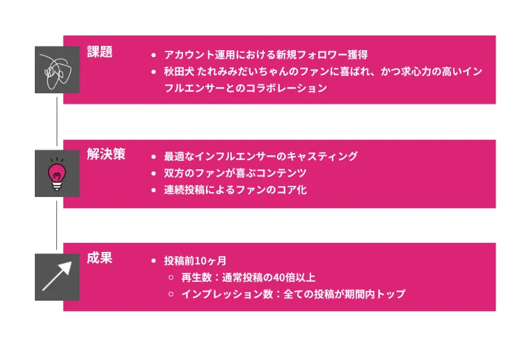 本施策は、秋田の魅力を発信している「秋田犬 たれみみだいちゃん」SNSアカウントの認知拡大を目的とした取り組みのひとつとして、ターゲットとの親和性、既存ファンも納得感を得られるインフルエンサーをキャスティングし、縦型ショート動画のクリエイティブトレンドを取り入れたコンテンツを制作、大きな反響を得ることに成功しました。
