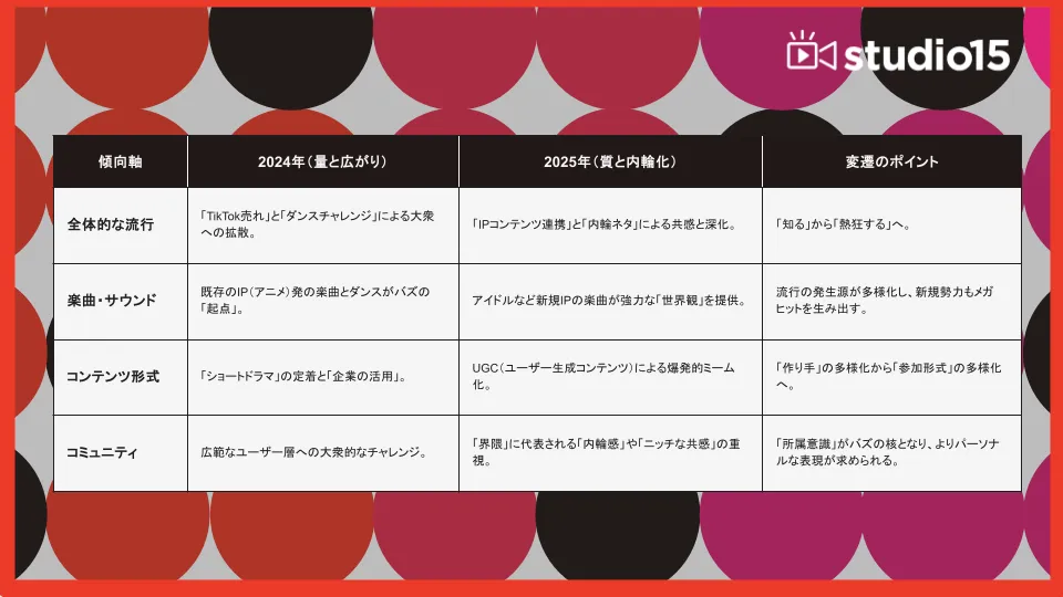 IPとの連携だけでなく、TikTokや縦型ショート動画というプラットフォームを前提に作られた新規コンテンツが、爆発的なスピードでメガヒットを生み出せる構造が確立。「音源に感情を乗せる」コンテンツが増加しました。