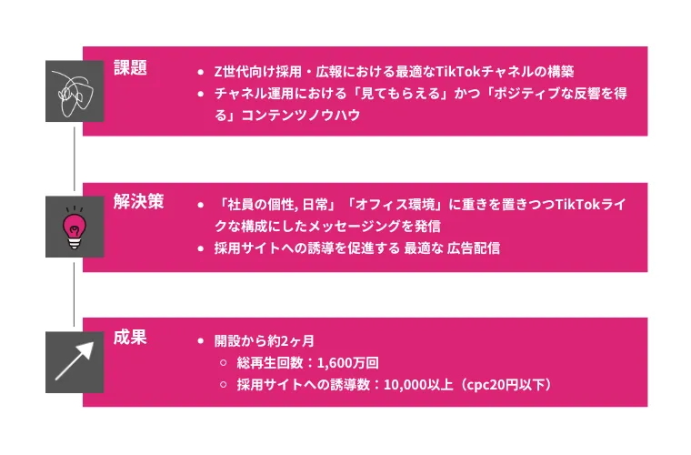 本事例では、採用を目的としたTikTokアカウント運用の中でも短期的に成果をあげるための「動画構成」だけでなく、費用対効果よく採用サイトへ誘導可能な「TikTok広告」を組み合わせた取り組みを紹介します。