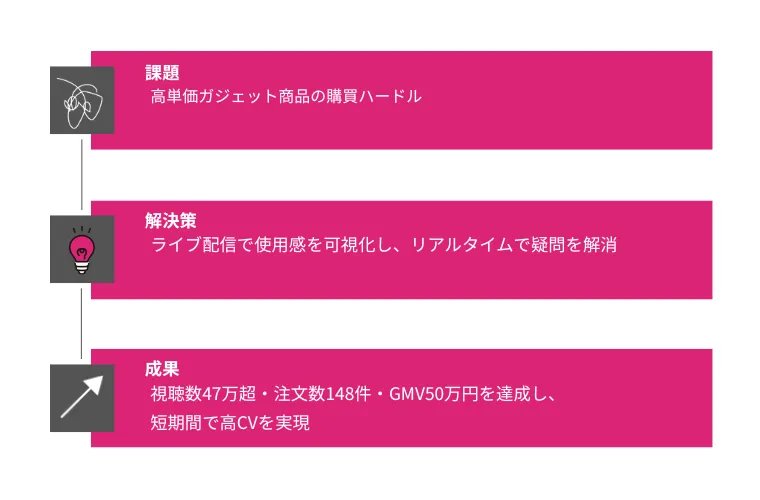 ガジェットでかつ高単価商品をTikTok Shopで販売していくにあたり、従来の広告やページ上の説明だけでは伝えきれないリアルな使い方や設置イメージを、ライブ配信を通じて可視化し、ユーザーとの距離を縮めることを念頭に実施。